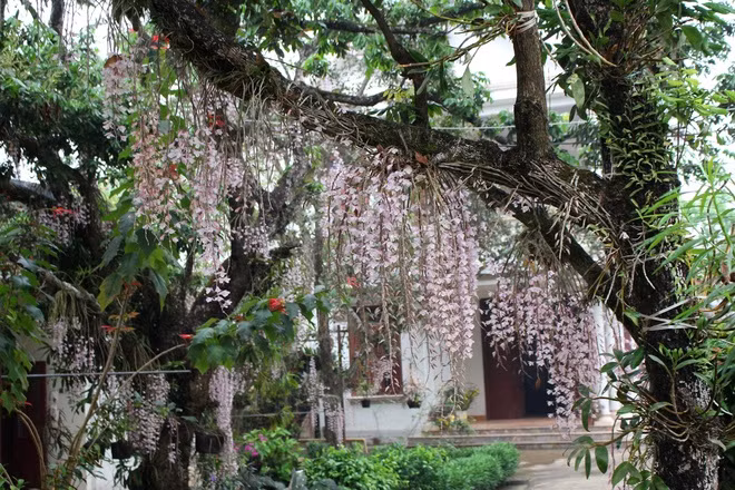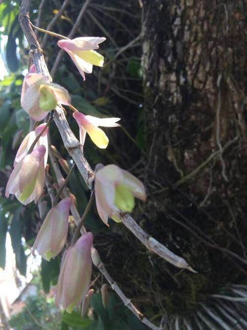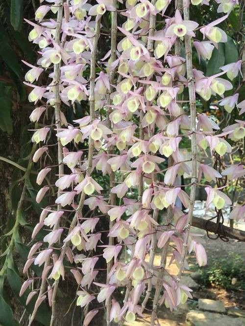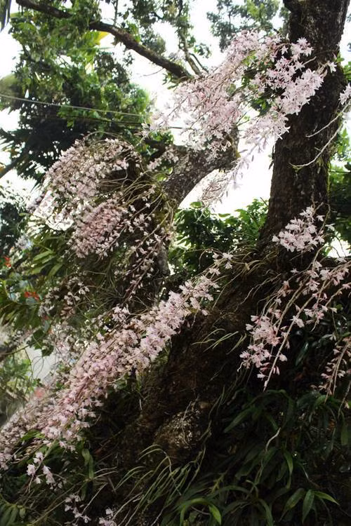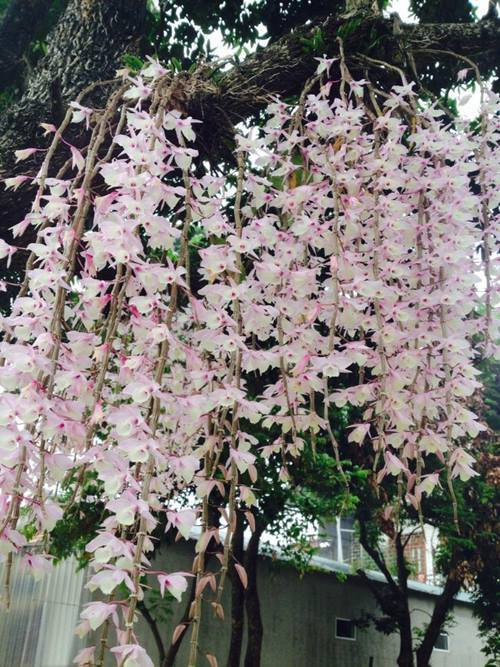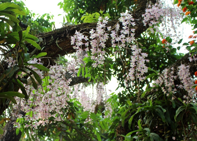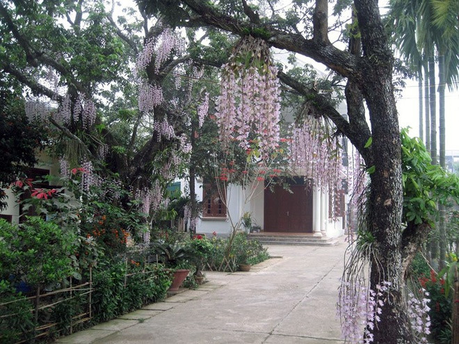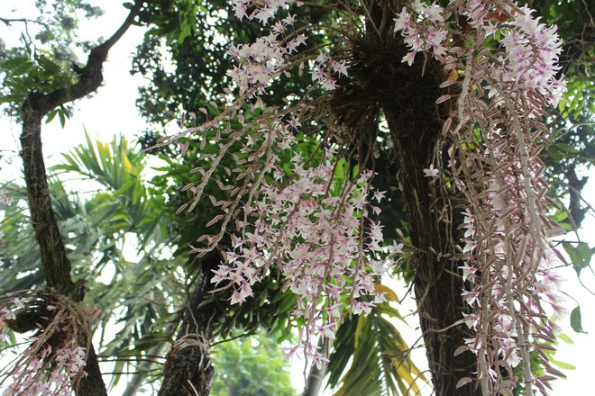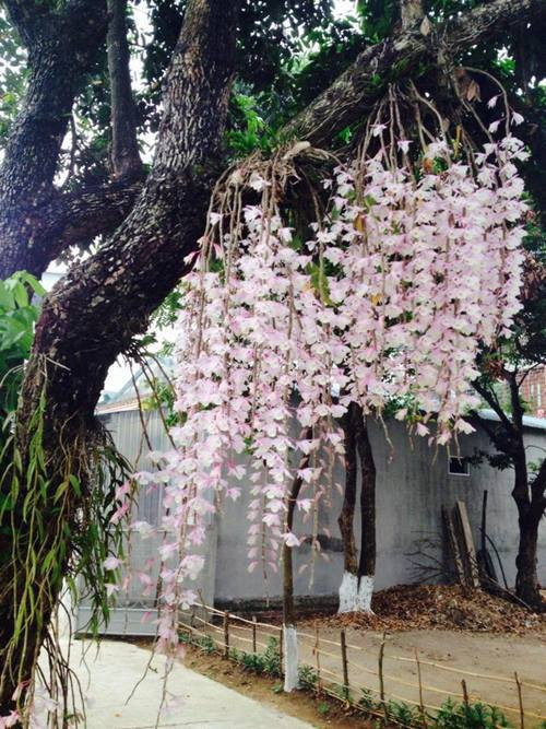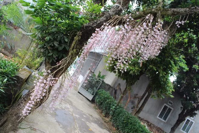 Yêu loài lan hạc vỹ, trong khi sân vườn nhà lại rộng và có nhiều cây nhãn, ông Thịnh đã trồng lan vào những cành thấp trên cây để tạo thế buông rủ xinh đẹp.