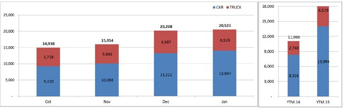 Tuy nhiên, nếu so sánh với cùng kỳ năm 2014 thì tổng doanh số bán hàng của toàn thị trường tính đến hết tháng 1/2015 đã tăng 80% so với tháng 1/2014. Trong đó, xe ô tô con tăng 64% và xe tải tăng 30% so với cùng kì năm 2014.