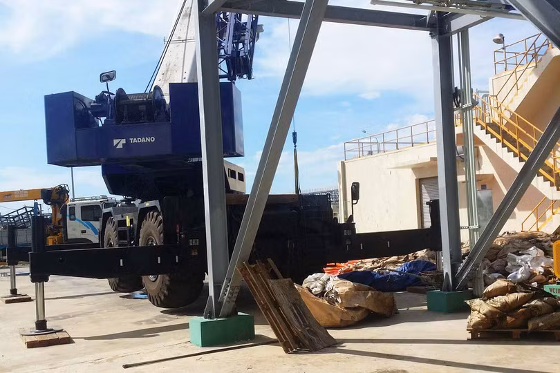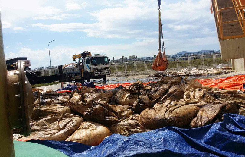 Những bao bì chất thải rất nặng, Formosa phải dùng cần cẩu để chuyển từng bao thải lên xe đợi sẵn. Chiếc xe này mang BKS 74C-04663