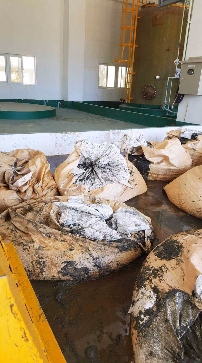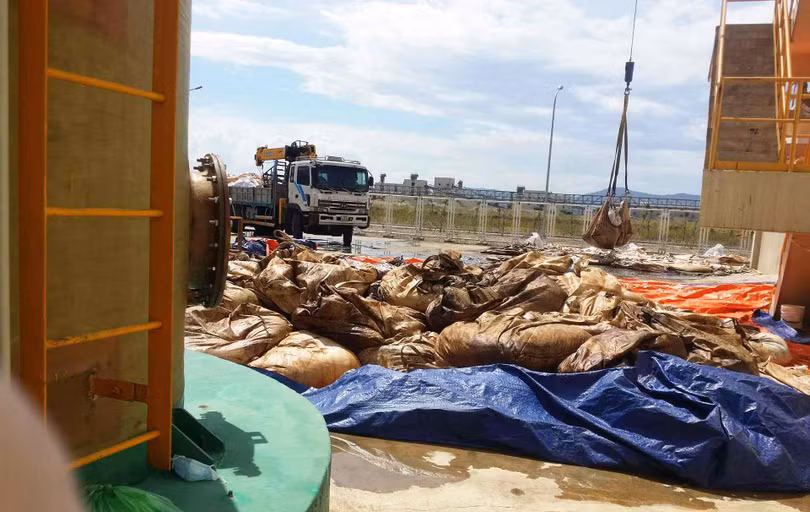 Bùn bánh được đóng gói sơ sài, vứt ngổn ngang ở nhà máy xử lý nước thải Formosa.