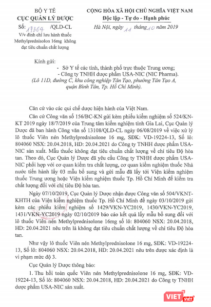 Căn cứ vào Phiếu kiểm nghiệm của Trung tâm Kiểm nghiệm tỉnh Gia Lai, Cục Quản lý Dược đã ban hành công văn xử lý lô thuốc viên nén Methylprednisolon 16mg do Công ty TNHH dược phẩm USA-NIC sản xuất, vì mẫu thuốc không đạt tiêu chuẩn chất lượng.