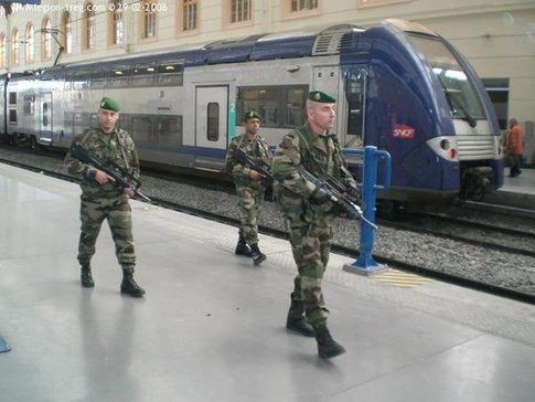 Ở những nơi công cộng như nhà ga, bến bãi ,địa điểm du lịch hoặc gần tòa nhà chính phủ sẽ xuất hiện quân đội với súng trường lăm le trên tay (băng đạn thường không được nạp trừ khi có báo động khủng bố). Đây là hình ảnh những Vệ binh Pháp với mũ nồi xanh đặc trưng.