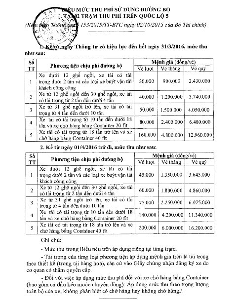 Mức thu phí đường bộ Quốc lộ 5 tại 2 trạm sẽ được điều chỉnh theo 2 giai đoạn. Trong đó, giai đoạn I (từ 1/12/2015 đến hết ngày 31/3/2016), giai đoạn II (từ ngày 1/1/2016) trở đi, cụ thể như sau: