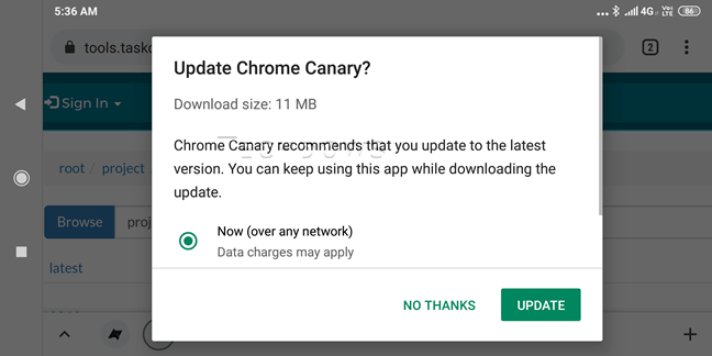 Đây là một tính năng thử nghiệm mới của Chrome Canary. Người dùng trình duyệt sẽ nhận thông báo bản khi có bản cập nhật mới và thực hiện tải về ngay trong Chrome mà không phải truy cập Google Play.