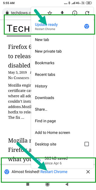 Khi tải xuống xong, bạn sẽ được yêu cầu khởi động lại Chrome, bạn có thể nhận thấy lời nhắc này trong menu. Bấm Update ready hoặc Restart Chrome, bản cập nhật sẽ được cài đặt từ Google Play.