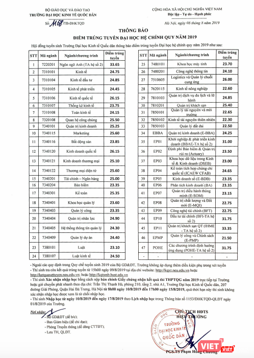 Điểm chuẩn vào Trường ĐH Kinh tế quốc dân: