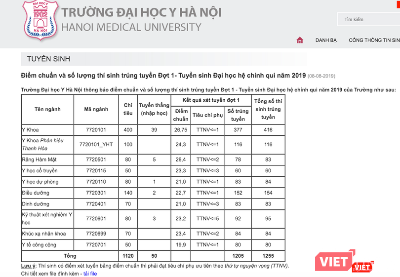 Điểm chuẩn vào Trường ĐH Y Hà Nội: