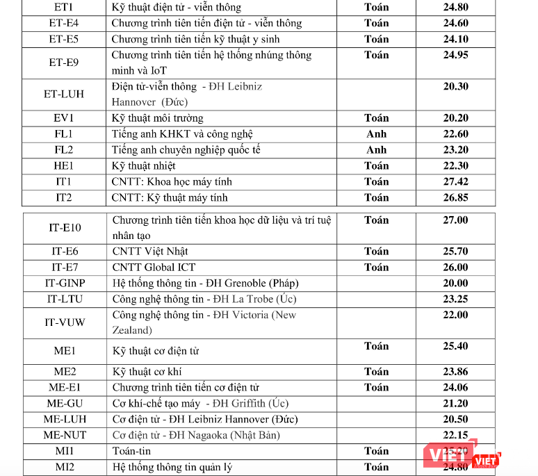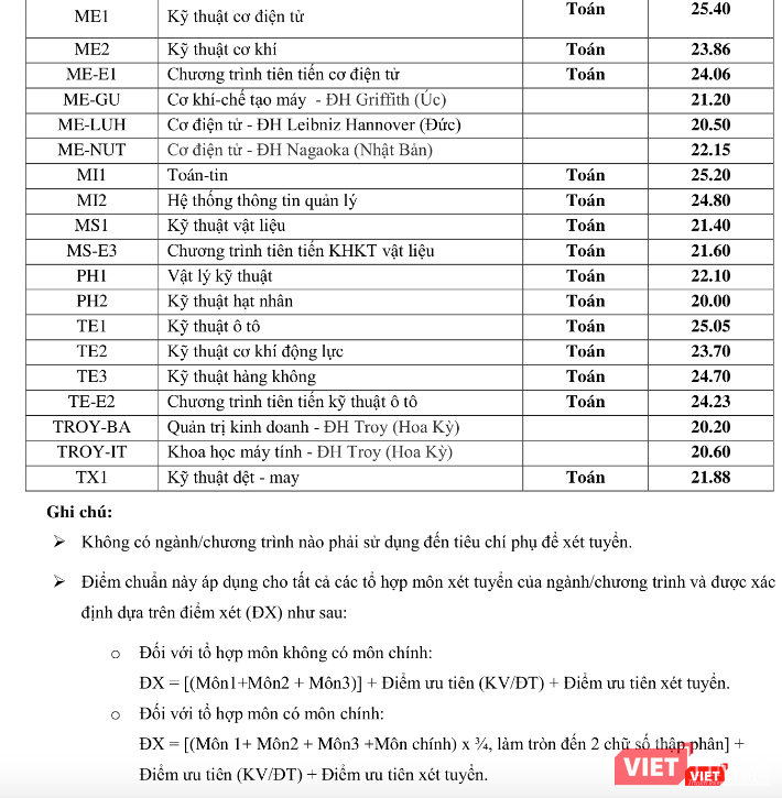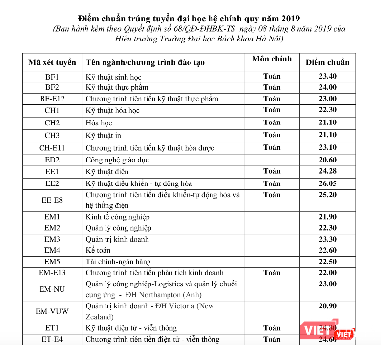 Dưới đây là điểm chuẩn trúng tuyển vào trường ĐH Bách khoa Hà Nội: