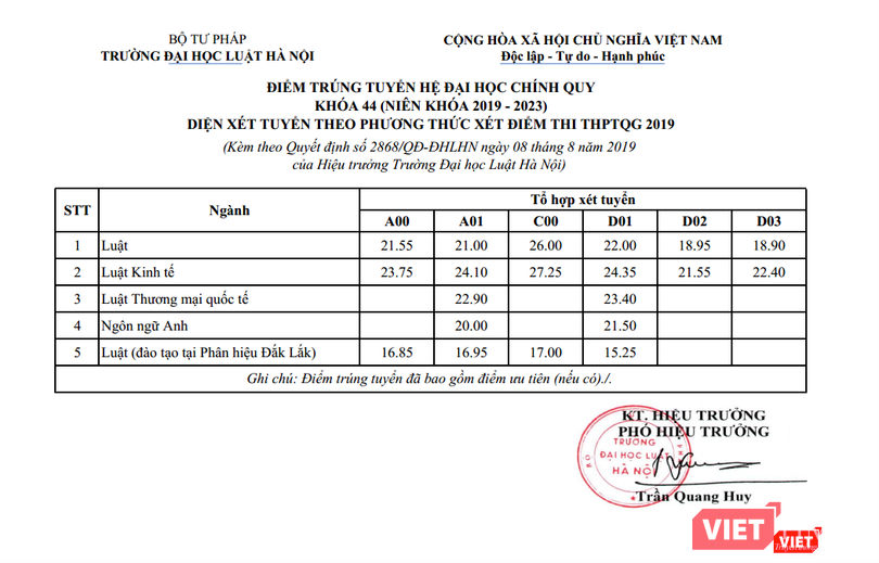 Điểm chuẩn trúng tuyển hệ ĐH chính quy của Trường ĐH Luật Hà Nội