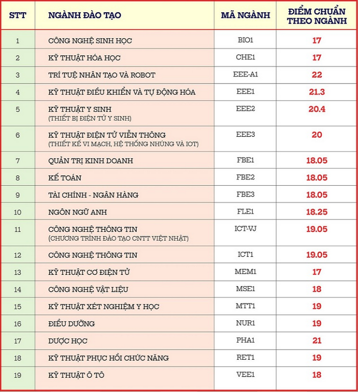 Điểm chuẩn các ngành theo phương thức xét học bạ