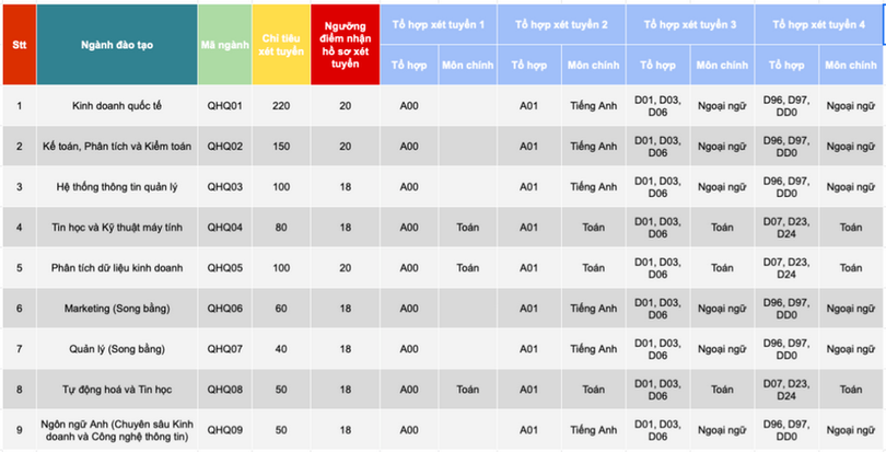 Thí sinh tham gia xét tuyển vào đơn vị này phải đảm bảo đồng thời các điều kiện sau: Có kết quả "Đạt" vòng sơ tuyển thông qua đánh giá hồ sơ và đánh giá trí thông minh cảm xúc EQ; Có điểm thi tốt nghiệp môn tiếng Anh đạt từ 4 (thang điểm 10) hoặc thí sinh có chứng chỉ tiếng Anh Ielts (hoặc tương đương) còn hạn sử dụng đạt từ 4.5; Có tổng điểm thi tốt nghiệp THPT năm 2021 của 3 môn thuộc tổ hợp xét tuyển hoặc có điểm thi đánh giá năng lực (tổng điểm 3 hợp phần) năm 2021 do Đại học Quốc gia hà Nội tổ chức đạt tối thiểu theo bảng sau: