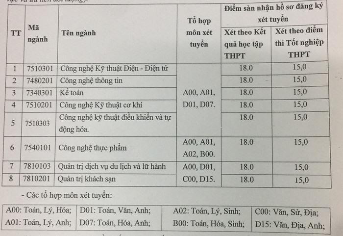 Nhà trường nhận hồ sơ của những thí sinh có tổng điểm các môn trong tổ hợp xét tuyển đạt từ 15,0 điểm trở lên.