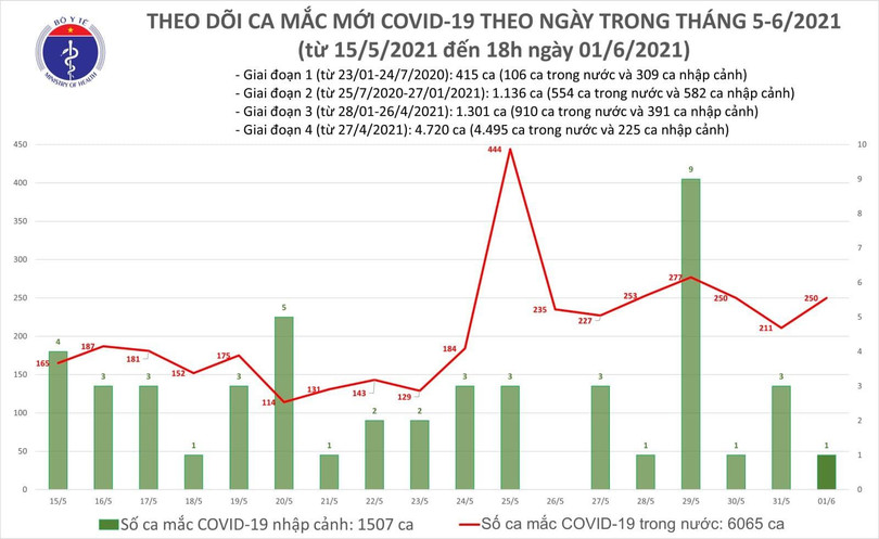 Trong ngày 1/6, Việt Nam ghi nhận thêm 251 ca mắc mới, trong đó 1 ca cách ly ngay khi nhập cảnh tại An Giang và 250 ca ghi nhận trong nước gồm Bắc Giang (124), TP. Hồ Chí Minh (70), Bắc Ninh (34), Lạng Sơn (12), Long An (3), Hà Nội (2), Hà Nam (2), Đồng Tháp (1), Trà Vinh (1), Vĩnh Phúc (1).