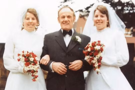 Cặp song sinh Ann và Linda chụp ảnh với cha của họ, ông Henry Green, trong ngày trọng đại. Ảnh: SWNS