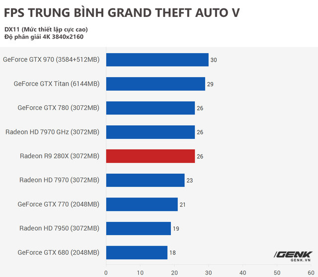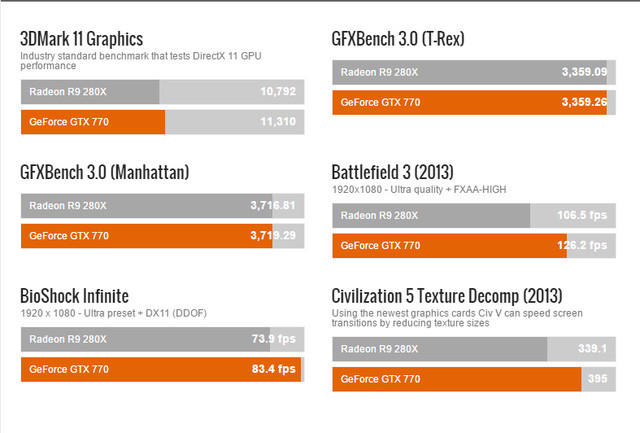 Không tính tới dòng sản phẩm VGA cao cấp như GTX 780 và R9 290X vốn có giá quá cao, dưới đây là số liệu so sánh các mã sản phẩm trung cấp ngang tầm là NVIDIA GTX 760, GTX 770 và AMD R9 280X cùng với R9 270X.