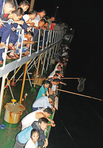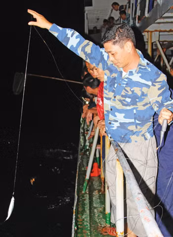 Người câu, người xem, hô vang rầm rộ. Những con cá chuồn đua nhau vui đèn lao lên boong tàu, là mồi câu lý tưởng nhất của các tay câu. Có người mới thả câu đã có cá cắn mồi, có người ngồi cả buổi thả câu rồi lại kéo không lên, người đi biển gọi là duyên câu cá. Nhưng không phải ai tham gia thả mồi câu đều muốn bắt cá, họ chỉ muốn ngồi thong dong với thời gian, nghe sóng vỗ mạn tàu cho vơi đi nỗi nhớ vợ con và người thân ở đất liền.