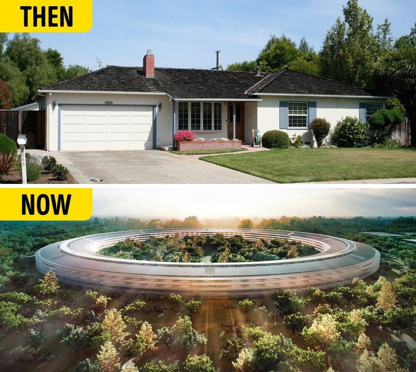 Steve Jobs và Steve Wozniak lắp ráp các máy tính đầu tiên của họ trong gara gia đình Jobs. Năm 2017, Apple đã hoàn thành việc xây dựng trụ sở mới - một tòa nhà bốn tầng tương lai sẽ được thiết lập trong khuôn viên rộng 2,6 cây số vuông với xấp xỉ 13.000 nhân viên. Hiện nay, Apple là một trong những công ty công nghệ đắt giá nhất toàn cầu.