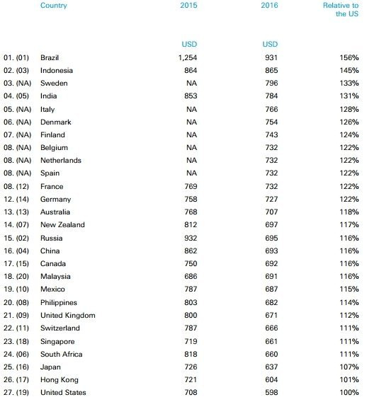 Trong khi ở Mỹ giá bán của 1 chiếc iPhone là 600 USD thì ở Brazil là 931 USD, ở Ấn Độ là 784 USD và ở Anh là 671 USD do sự dao động của tỷ giá và thuế trong nước. Không những vậy, số tiền phải bỏ ra để mua 1 chiếc iPhone lớn hơn so với khi mua dòng Android, thiết bị có các tính năng gần giống với iPhone. Dưới đây là bảng so sánh giá của ngân hàng Deutsche Bank: