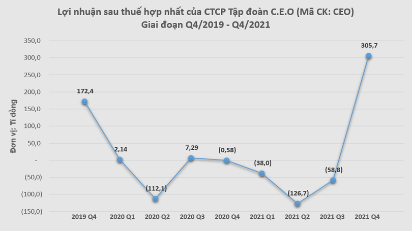Trừ đi chi phí, CEO báo lãi sau thuế quý 4/2021 lên tới 305,7 tỉ đồng, trong khi cùng kỳ năm trước báo lỗ 0,58 tỉ đồng. Khoản lợi nhuận này giúp CEO chấm dứt chuỗi 4 quý liên tiếp thua lỗ, đồng thời đảo chiều lợi nhuận của cả năm 2021 với khoản lãi sau thuế 82,1 tỉ đồng.