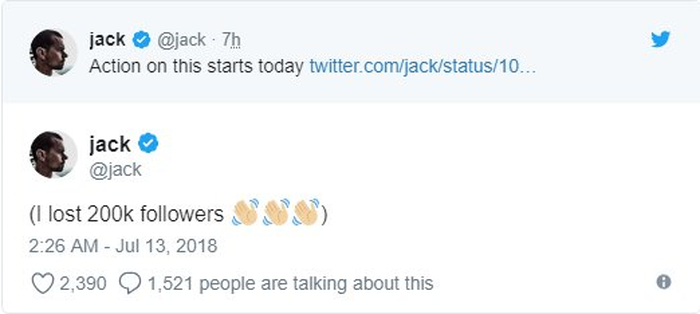 Trước đó một ngày, Jack thông báo khi kế hoạch bắt đầu được triển khai: "Chúng tôi sẽ xóa các tài khoản Twitter bị khóa (khi phát hiện được những hành vi thay đổi đáng ngờ) dựa vào từng profile trên toàn cầu. Số lượt theo dõi hiển thị ở trên profile có thể bị giảm", kèm theo hashtag #health.