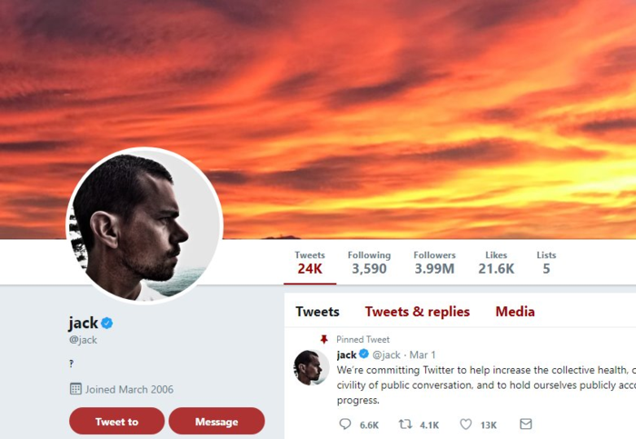 Tuy đã mất đi không ít người theo dõi nhưng CEO Jack vẫn tích cực đăng bài trên Twitter của mình, tính đến thứ 5 vừa qua thì còn gần 4 triệu người đang theo dõi tài khoản của anh. Đầu năm nay trong một cuộc phỏng vấn Jack từng nhắc tới cuộc cải tổ cho Twitter nhưng không nhấn mạnh đến việc nó sẽ giảm lượt người theo dõi như vừa qua.