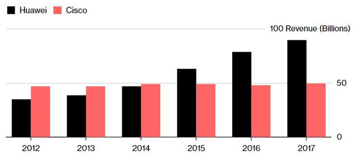 Doanh thu Huawei tăng nhanh hơn nhiều so với đối thủ Cisco trong những năm gần đây. Ảnh: Bloomberg.