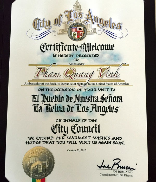 Hội đồng thành phố Los Angeles trao “Certificate of Welcome” chào đón Đại sứ Việt Nam thăm thành phố Los Angeles.
