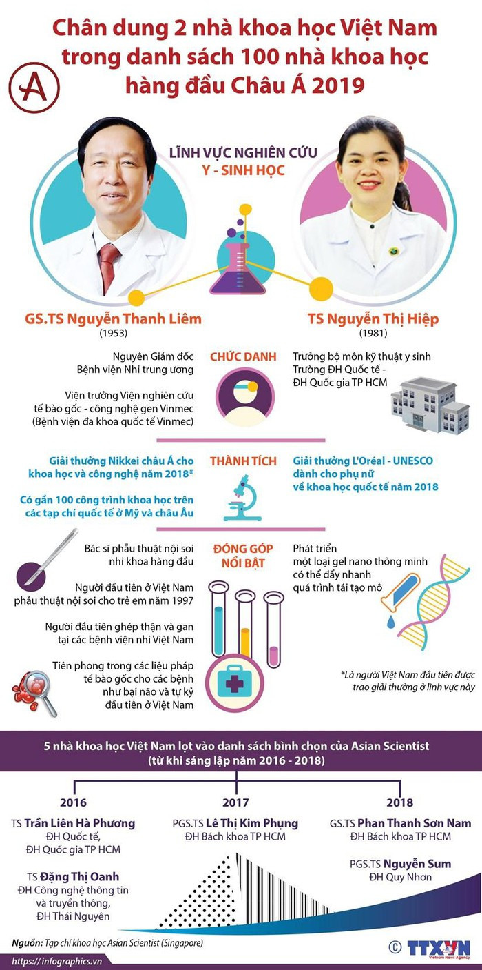 Giáo sư, tiến sỹ Nguyễn Thanh Liêm và tiến sỹ Nguyễn Thị Hiệp vừa được tạp chí khoa học Asian Scientist (Singapore) bình chọn là hai trong 100 nhà khoa học hàng đầu châu Á năm 2019 vì có thành tích xuất sắc trong lĩnh vực nghiên cứu y-sinh học./.