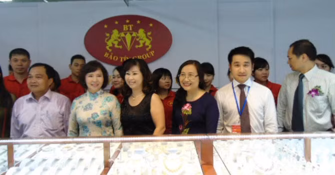 Ông Vũ Hùng Sơn, Giám đốc Trung tâm Thông tin Công nghiệp và Thương mại (thứ 2 từ phải qua) và lãnh đạo Bộ Công Thương tại gian hàng CTCP Bảo Tín trong Hội chợ triển lãm "Tuần nhận diện hàng Việt Nam 2015 - Tự hào hàng Việt Nam". Ảnh: BizLIVE