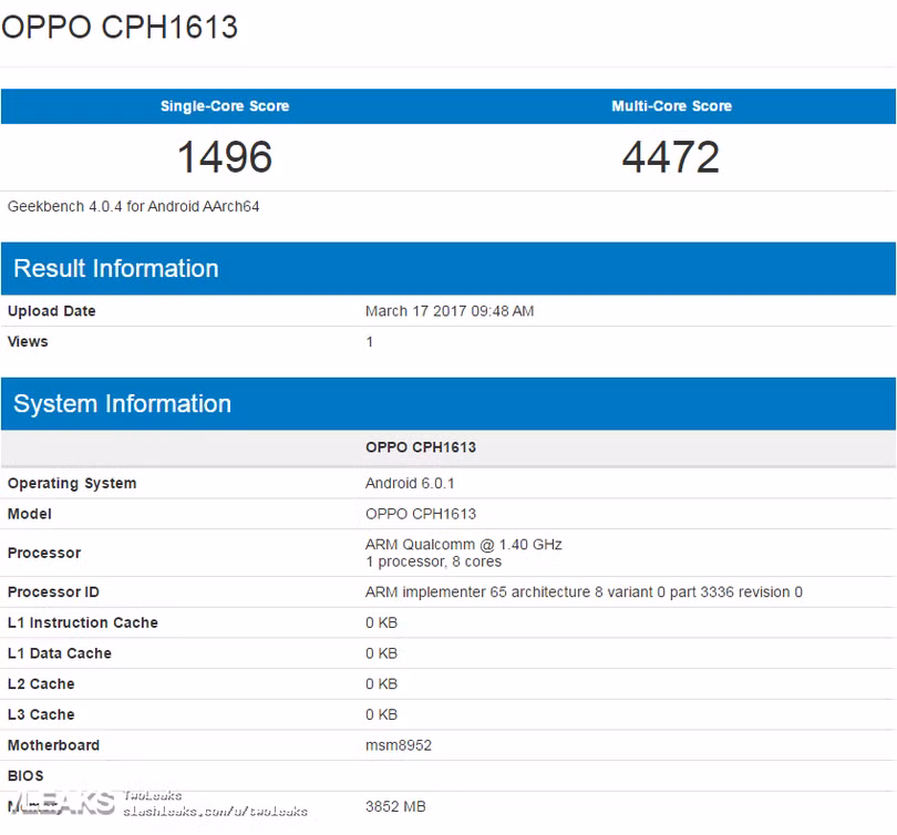 Điểm GeekBench của sản phẩm được cho là Oppo F3 Plus cùng cấu hình cơ bản bị rò rỉ trên mạng.