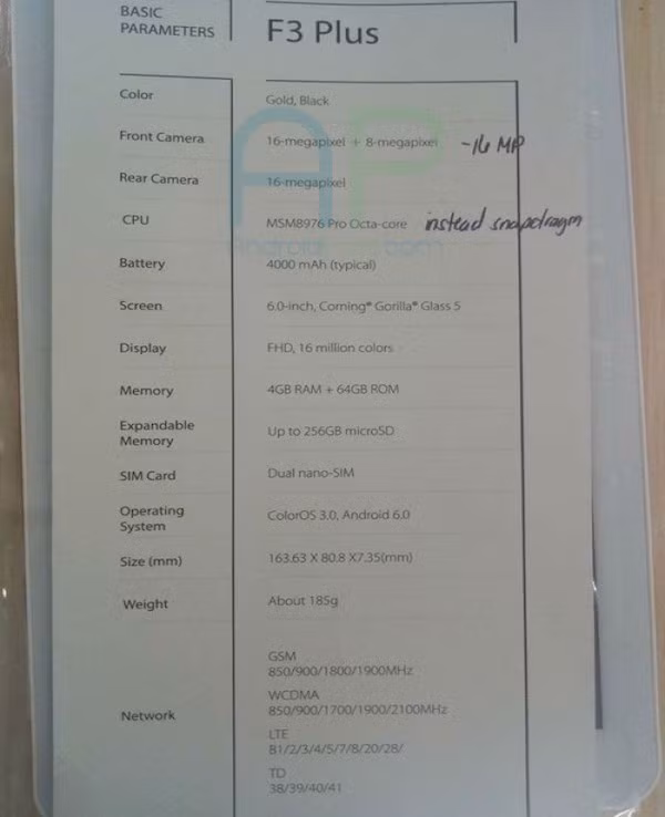 Thông tin về cấu hình của Oppo F3 Plus đã được rò rỉ khá đầy đủ. Đây là smartphone chuyên selfie thế hệ mới của Oppo với camera kép ở phía trước 16MP và 8MP cùng camera sau 16MP. Sản phẩm có màn hình IPS LCD 6 inch độ phân giải Full-HD, vi xử lý Qualcomm Snapdragon 653 tám lõi tốc độ 1.95 GHz, RAM 4GB, bộ nhớ trong 64GB, hỗ trợ thẻ nhớ mở rộng tối đa 256GB, pin 4000 mAh hỗ trợ công nghệ sạc nhanh VOOC độc quyền của Oppo và cảm biến vân tay một chạm tích hợp trên phím Home mặt trước.