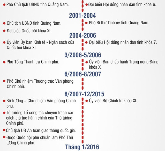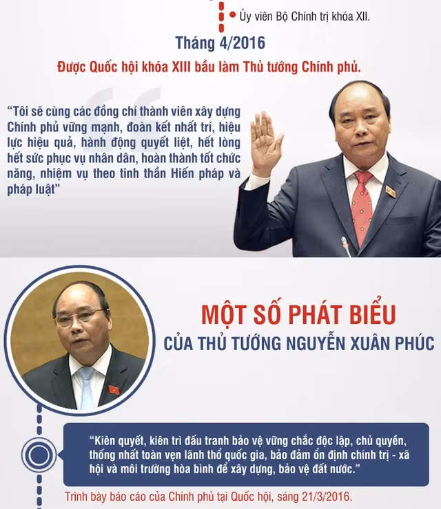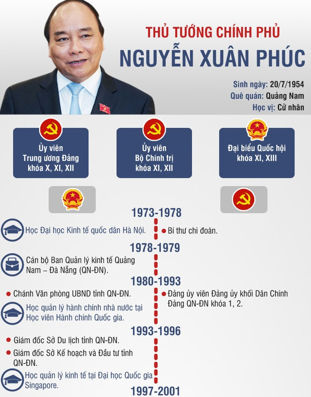 Trước khi được bầu làm Thủ tướng Chính phủ, ông Nguyễn Xuân Phúc đã đảm đương nhiều cương vị khác nhau như Phó Thủ tướng Chính phủ, Bộ trưởng - Chủ nhiệm Văn phòng Chính phủ, Phó Tổng Thanh tra Chính phủ, Chủ tịch UBND tỉnh Quảng Nam…