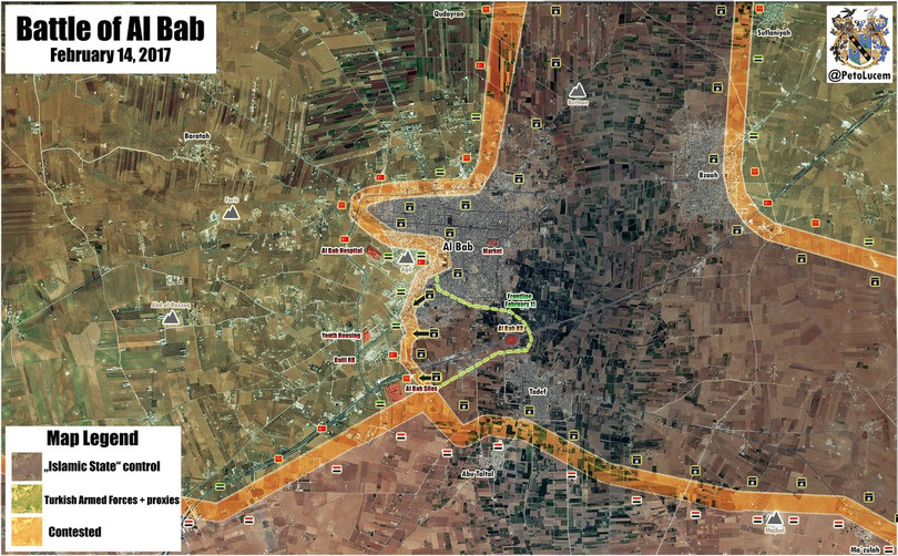 Tối ngày 13.02.2017, nhóm chiến binh IS trong thành phố, mặc dù đã bị bao vây hoàn toàn, tiến hành cuộc phản công dữ dội đánh vào lực lượng vũ trang Lá chắn Euphrates do quân đội Thổ Nhĩ Kỳ dẫn đầu. Sự kiện này khoét sâu thêm thất bại của lực lượng Thổ Nhĩ Kỳ khi cố gắng đánh chiếm Qabasin và Bzaah trên hướng đông Al-Bab.
