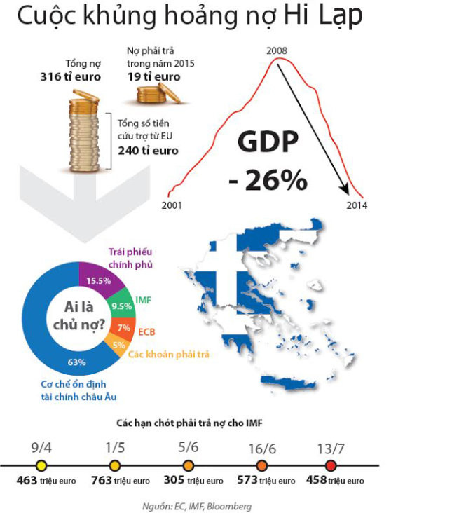 Phần lớn nhất trong các gói cứu trợ là từ Cơ quan ổn định tài chính châu Âu, với Đức và Pháp là những cổ đông chính. Đó là chưa kể các chi phí hỗ trợ hệ thống ngân hàng Hi Lạp của Ngân hàng Trung ương châu Âu (ECB), đưa tổng nợ của Athens với nước ngoài lên mức 316 tỉ euro.