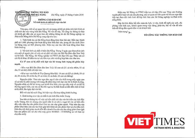 Sau khi thông tin phản ánh biển Đà Nẵng xuất hiện cá chết tấp vào bờ, chiều 27/4, Tổ công tác thông tin báo chí của TP Đà Nẵng đã gửi Thông tin báo chí đến các cơ quan báo chí những thông tin do Sở NN-PTNT cung cấp.