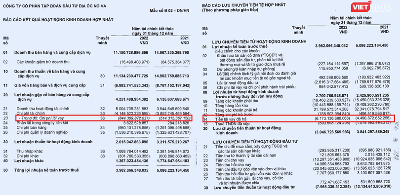Đối với trường hợp của Novaland, Tiền lãi vay đã trả được ghi nhận trên báo cáo lưu chuyển tiền tệ năm 2022 có giá trị lên tới 6.173,1 tỉ đồng – cao gấp 7 lần chi phí lãi vay được ghi nhận trên báo cáo kết quả kinh doanh.