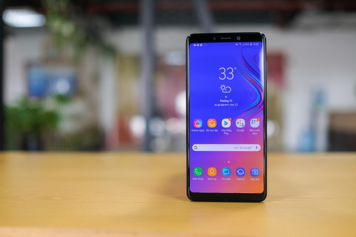 Máy có màn hình Super AMOLED 6,3 inch Full HD+, cho khả năng hiển thị tốt trong điều kiện ngoài trời, màu sắc rực rỡ và độ sáng cao. Vì không theo trào lưu màn hình khuyết đỉnh, Galaxy A9 có khoảng trống ở phần trên và dưới màn hình.