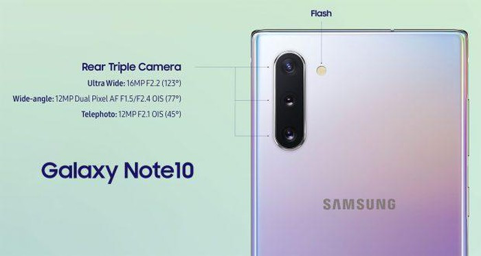 Đây là lần đầu tiên Samsung trang bị bốn camera cho thế hệ Note và mang đến nhiều tính năng nhiếp ảnh mới thực sự. Với Galaxy Note 10, máy gồm có một ống kính góc siêu rộng 123 độ (16MP, F/2.2), một ống kính góc rộng 77 độ (12MP, F/1.5 – F/2.4, OIS, Dual Pixel AF) và một ống kính Tele 45 độ (12MP, F/2.1, OIS).