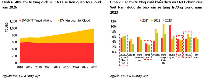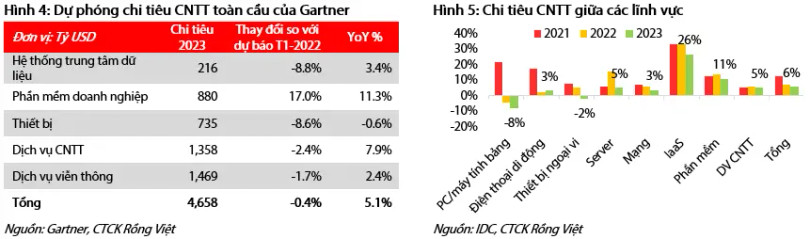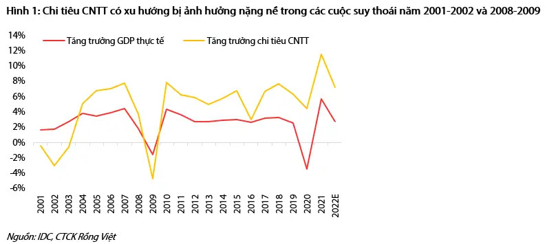 “Mặc dù quá trình chuyển đổi số và triển khai Cloud khó có thể bị đảo ngược, nhưng tăng trưởng chi tiêu cho CNTT vào năm 2023 nhiều khả năng sẽ chậm hơn so với các dự báo trước đó do kỳ vọng về triển vọng tăng trưởng kinh tế năm 2023 yếu đi khi càng gần đến cuối năm 2022”, VDSC cho hay.