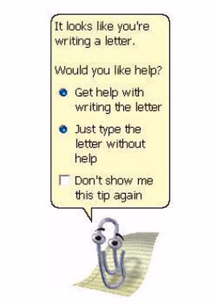 Xuất hiện lần đầu trong bản Office 97, ứng dụng Clippy được Microsoft tạo nên để cung cấp những gợi ý giúp người dùng sử dụng bộ Office hiệu quả hơn. Tuy vậy, biểu tượng Clippy, với hình dáng chiếc kẹp giấy có đôi mắt to tròn, thường xuyên xuất hiện trong giao diện sử dụng đã khiến không ít người cảm thấy khó chịu.
