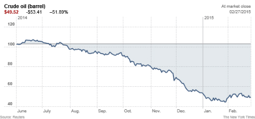 Giá dầu thế giới giảm mạnh từ giữa năm 2014 giúp Trung Quốc tiết kiệm hàng chục tỷ USD khi nhập khẩu dầu dự trữ. Đồ họa: NYT