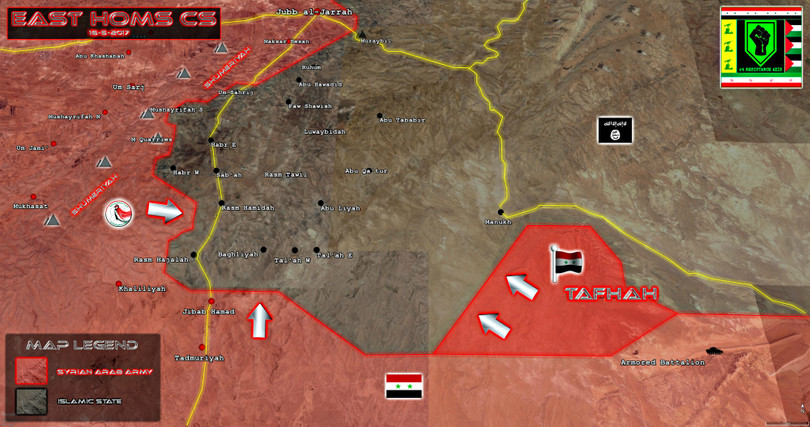 Quân đội Syria tiếp tục chiến dịch quân sự tấn công truy đuổi IS trên vùng nông thôn Homs. Từ căn cứ quân sự Battalion bị bỏ hoang, được giải phóng các đây 2 tuần, các đơn vị vũ trang Syria tổ chức đợt tấn công ác liệt, đánh chiếm được ngọn núi Al-Tafhah từ hai hướng đông và tây bắc.