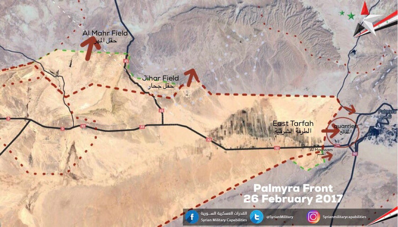 Các đơn vị thuộc quân đoàn tình nguyện số 5, phối hợp với lực lượng sư đoàn tăng số 18 đánh lên ngọn đồi lớn Tal SyriaTel sáng ngày 26.02, tập kích trận địa phòng ngự của IS trên sườn phía nam.
