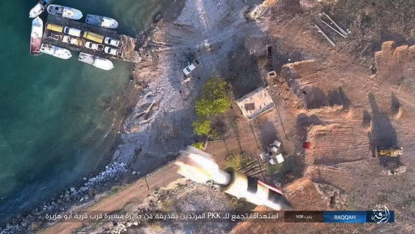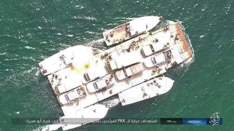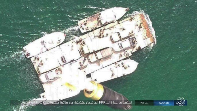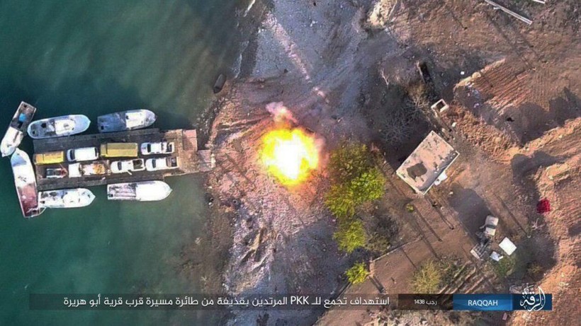 IS công bố một số bức ảnh trên mạng xã hội Twitter, ghi lại cảnh các tay súng khủng bố sử dụng UAV ném bom tự chế vào một chiếc phà, chở những chiến binh người Kurd cùng các xe cơ giới vượt qua hồ Assad gần thành phố Tabqa.