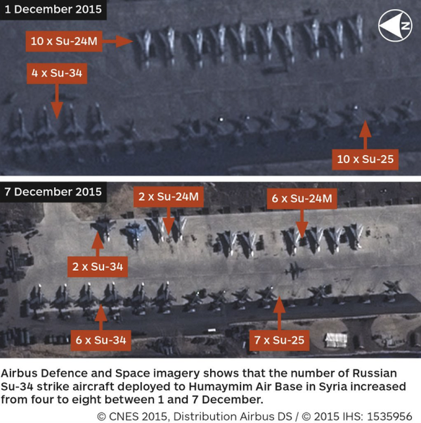 Hình ảnh vệ tinh AirBuss cho thấy xuất hiện thêm 4 chiếc Su-34 ở căn cứ không quân Hmeymim.