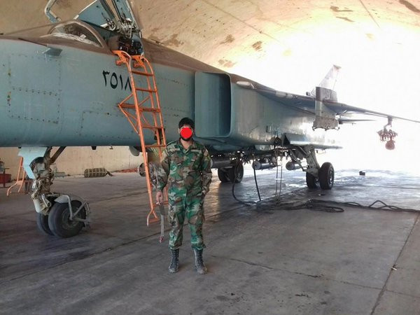 Một quân nhân Syria đứng bên cạnh chiếc Su-24 của không quân Nga