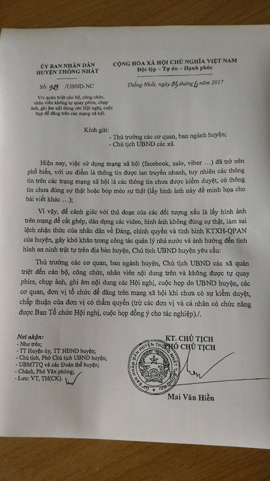 UBND huyện Thống Nhất yêu cầu thủ trưởng các cơ quan quán triệt đến cán bộ, công chức, nhân viên trên địa bàn không được tự quay phim, chụp ảnh, ghi âm nội dung các hội nghị, cuộc họp do huyện và các cơ quan đơn vị tổ chức để đăng trên mạng xã hội khi chưa có sự chấp thuận của đơn vị có thẩm quyền. Ngoại trừ các trường hợp quay phim, chụp ảnh, ghi âm các hội nghị cuộc họp có sự đồng ý tác nghiệp của ban tổ chức thì không bị cấm.