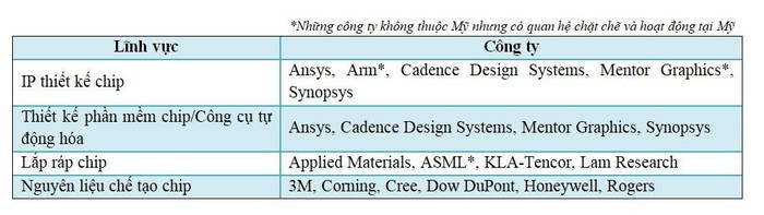 Các công ty hàng đầu trong lĩnh vực thiết kế chip đều là doanh nghiệp Mỹ. Có thể kể đến như Cadence Design Systems, Synopsys và Ansys. Mentor Graphics - nhà cung cấp công cụ thiết kế chip lớn thứ ba thế giới - Siemens (Đức) mua lại hồi năm 2016, nhưng vẫn duy trì hoạt động tại Mỹ.