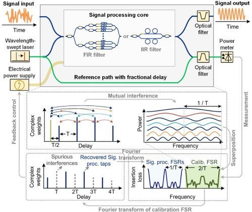 | Sơ đồ khái niệm của phương pháp phục hồi pha dựa trên đường tham chiếu độ trễ phân số. Chip này bao gồm một lõi xử lý tín hiệu và một đường dẫn tham chiếu với độ trễ phân đoạn. Ảnh Optica. |