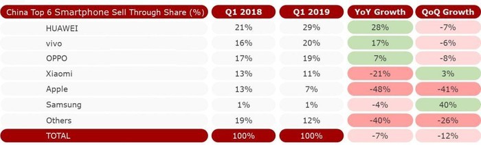 Trong quý I/2019, Huawei dẫn đầu thị trường điện thoại thông minh Trung Quốc với thị phần 29%. Vivo và Oppo bám sát nhau với thị phần trên dưới 20%.